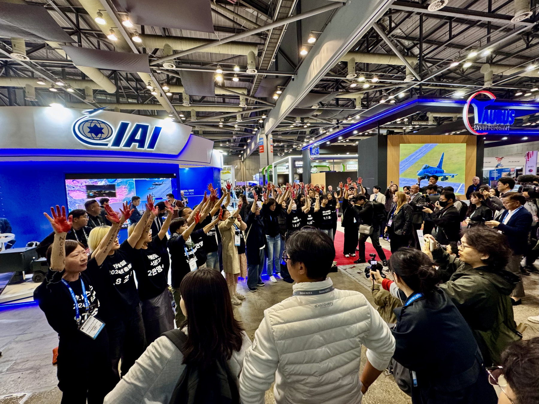 액션에 참가했던 모든 활동가가 밖으로 나간 뒤, 나와 촬영자 몇몇은 전시장에 남았다. 그들이 떠난 자리에 남아있는 작은 메아리, 외침이 만들어낸 작은 균열, 혼돈을 내 눈으로 확인하고 싶었다. IAI 부스 앞 한국인 직원들은 이스라엘 관계자로 보이는 이들에게 상황을 설명하기에 급급했다.