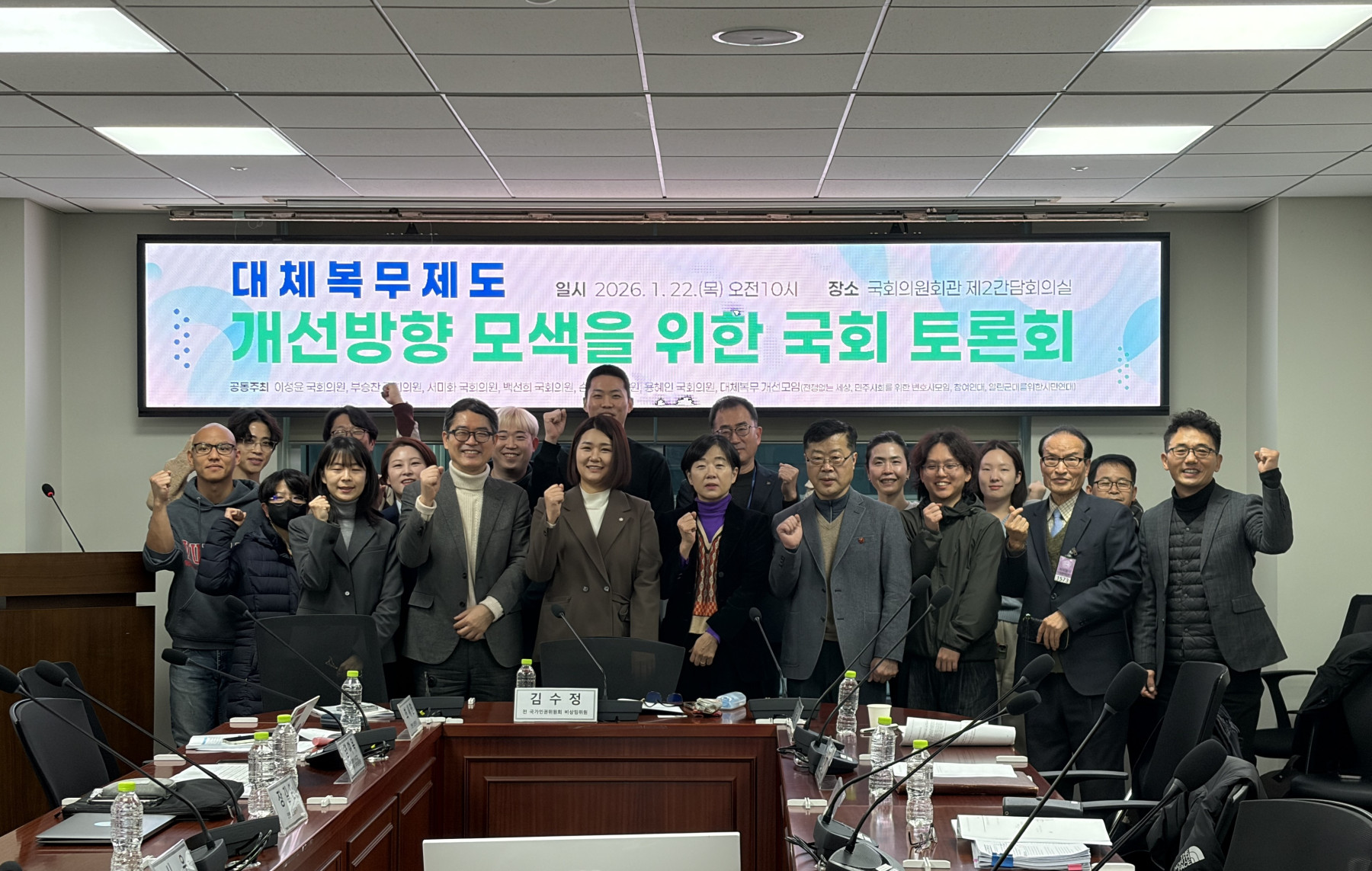 - 이처럼 지난 5년 동안 많은 개선점을 드러낸 대체복무제의 문제점을 살펴보고 개선 방향을 모색하는 국회 토론회가 1월 22일, 국회 의원회관 제2간담회실에서 열렸다. 토론회는 민주당 이성윤, 부승찬, 서미화 의원, 조국혁신당 백선희 의원, 진보당 손솔 의원, 기본소득당 용혜인 의원과 대체복무 개선모임(민주사회를위한변호사모임, 열린군대를위한시민연대, 전쟁없는세상, 참여연대)가 함께 주최했다. 토론회 좌장을 맡은 민변 김수정 변호사는 1월 20일 구속된 병역거부자 나단의 사례를 언급하며 양심의 자유를 보호하지 못하는 지금의 대체복무제도의 문제를 다시 한 번 환기했다.